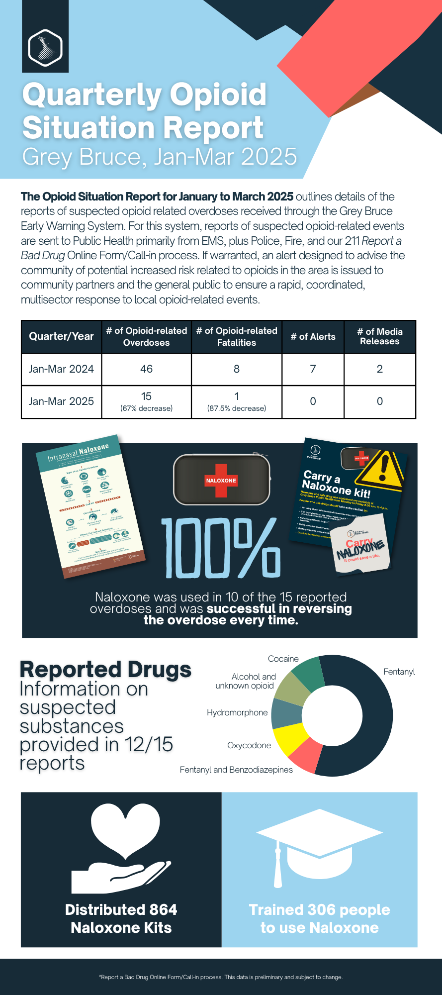 Stay informed and engaged with our new quarterly infographic series, dedicated to shedding light on the ongoing Opioid Crisis in Grey Bruce. Each quarter, we will summarize the latest data, key trends, and noteworthy developments related to opioid use and its impacts within our community.